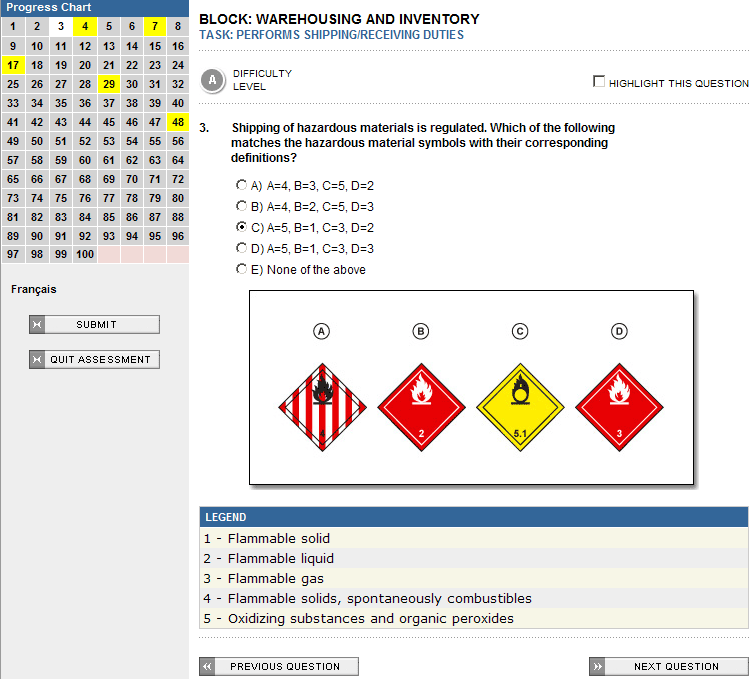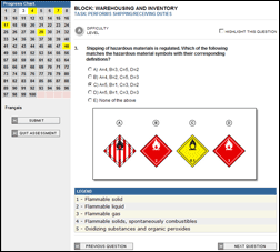 Pictures, schematics and various legends are used to provide a much more interesting and exciting assessment. Users always know which tasks/skill areas the assessment is addressing at a given time by a guide at the top of the screen.